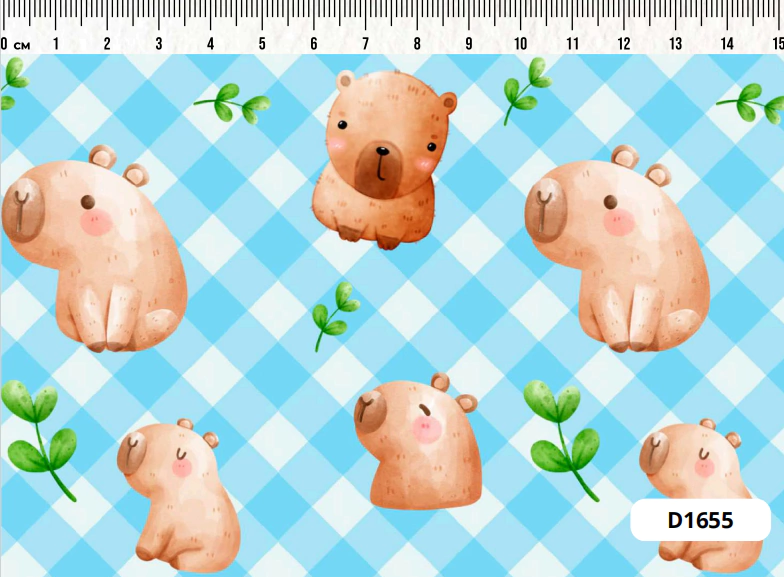 Estampa capivaras e folhinhas com fundo xadrez azul.