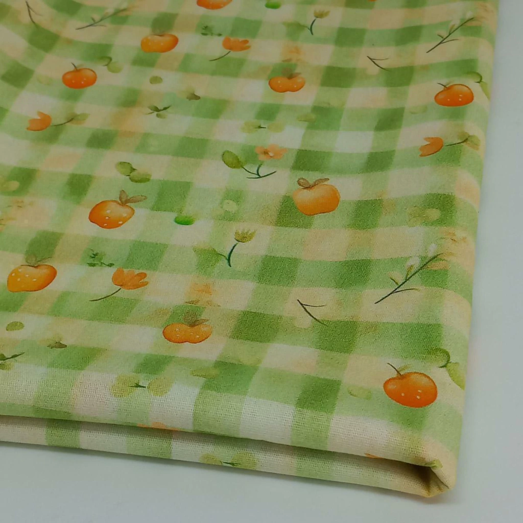 Estampa com fundo xadrez e desenhos de frutinhas e florzinhas em tom verde e laranja que conversam com todas as demais estampas da coleção.