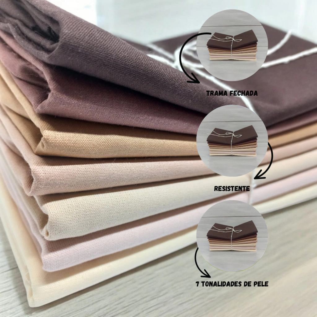 A textura e elasticidade deste tecido é parecida com a do algodão crú, só que muito mais macio e com 7 tonalidades de pele.